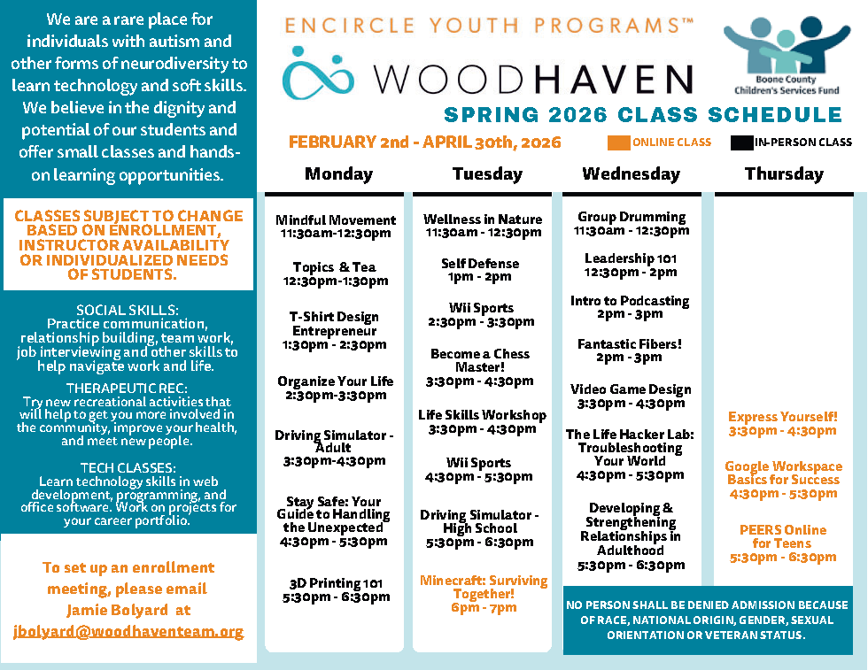 Spring Encircle Technology classes at Woodhaven will begin February 2, 2026. Initial Interview is required for new students.